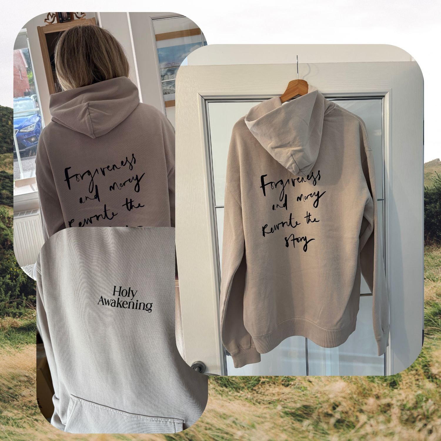 The new Holy Awakening Hoodie. High quality relaxed fit jumper in Faded Bone colour with black text. 'Forgiveness and Mercy Rewrite The Story' back print. Now available for order!